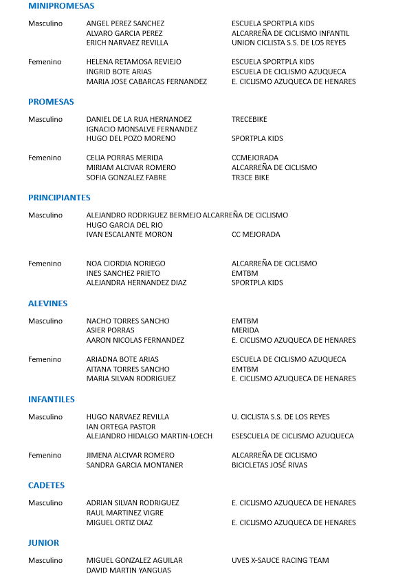 Aquí os dejamos la información de los primeros clasificacos de cada categoría.